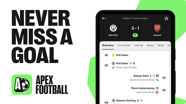 Get live goal alerts with the Apex Football app.